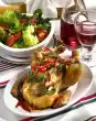 Clean, wash and cut the peppers into thin strips. Drain the corn and cut in half lengthwise. For the vinaigrette, mix vinegar and 2 tablespoons of chilli sauce and fold in 3 tablespoons of oil and peanut oil.