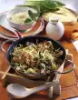 Peel onion, chop coarsely. Clean, wash and chop the zucchini and peppers. Whisk milk, salt, pepper and tarragon. Mix breadcrumbs and cheese