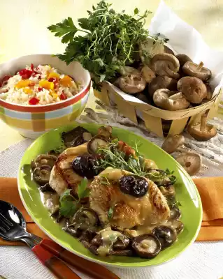 Season meat with salt and pepper, keep warm. Fry the mushrooms in the cooking fat in portions while turning. Fry onions and thyme briefly. Stir in 400 ml water, cream and stock, bring to the boil. Bind with sauce thickener. Season to taste with salt, pepper and port wine. Arrange everything, garnish if necessary