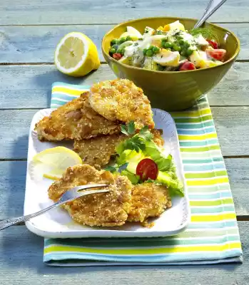 Cut the potatoes into slices. Mix all ingredients with the sauce. Crumble the crackers. Wash meat, dab dry and season lightly with salt and pepper. Beat 1 egg in a plate. Turn meat one after the other in flour, egg and cracker crumbs. Heat 2 tablespoons of oil in a pan. Fry 4 escalopes in it on each side for 3-5 minutes until golden brown. Fry the rest of the oil and escalopes in the same way. Arrange salad in a bowl and garnish with dill. Arrange the schnitzel on a plate. Garnish with lettuce, tomato, lemon and parsley