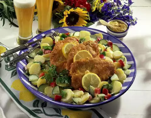 Season salad again and arrange on a plate with the escalopes. Garnish as desired with lemon slices and chervil