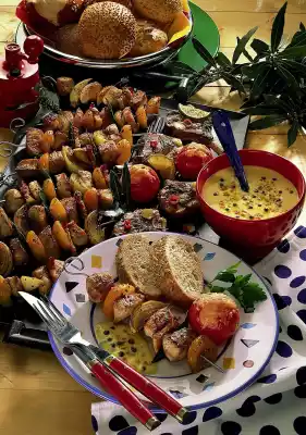 Wash the laurel and dab dry. Place the meat, apricots, bacon, onions and bay leaf alternately on eight skewers. Wash and clean the tomatoes, cut them crosswise and sprinkle with cheese. For the curry sauce, mix yoghurt, mayonnaise, curry and some apricot juice.