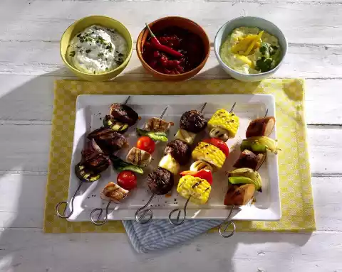 Wash the meat, dab dry and cut into walnut-sized pieces. Wash tomatoes and pat dry. Clean and wash spring onions and cut them into pieces about 3 cm long. Put meat, cherry tomatoes and spring onions on 8 skewers.