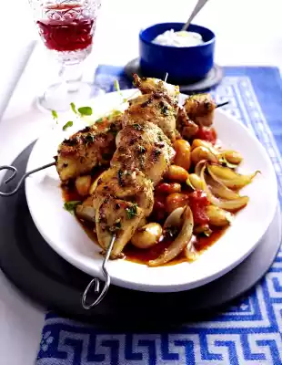 Put meat on 4 skewers. Mix 4 tablespoons olive oil, remaining garlic and oregano, sweet paprika, a little salt and pepper. Heat a pan without fat. Brush the meat with the marinade and fry it in the hot pan while turning for about 6 minutes.