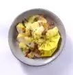 Clean, wash and drain the spinach. Peel and finely chop the onion. Fry in 1 tbsp. hot oil. Add spinach dripping wet, fry briefly. Season and drain well