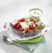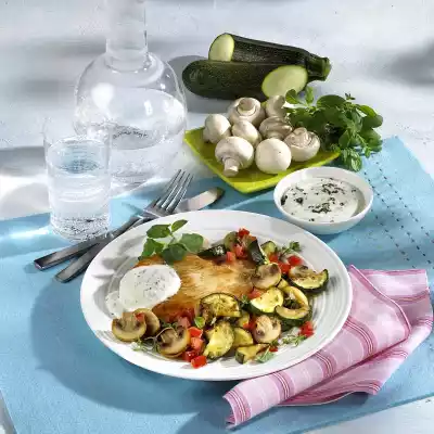 Clean and wash the zucchini and mushrooms. Halve the zucchini lengthwise and cut into slices. Cut the mushrooms into small pieces. Wash and quarter tomatoes, remove seeds if necessary and dice finely. Wash fresh herbs, remove leaves
