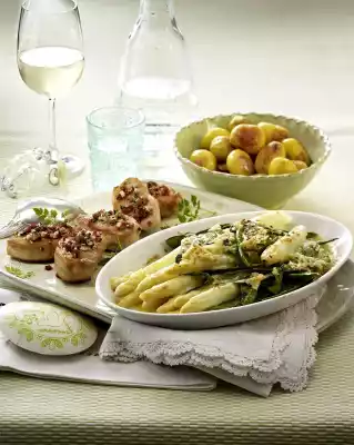 Wash the turkey fillets, dab dry and cut into approx. 12 medallions. Wash parsley and basil, shake dry and cut into fine strips, except for a little bit for garnishing. Peel and finely chop the onion. Heat the oil in a large frying pan, fry the medallions for 5-6 minutes while turning them and season with salt and pepper. Remove from the pan. Fry the onion and diced ham in hot frying fat, turning briefly and mix with the herbs. Place the turkey medallions on the plate with the asparagus au gratin. Spread herb and ham crisp on the medallions and garnish with basil as desired. Serve with boiled potatoes