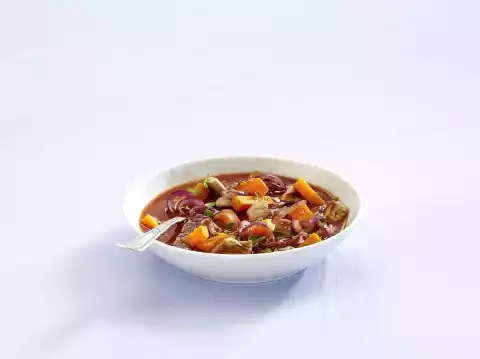 Sauté the turkey cubes in it and season with salt and pepper. Remove meat from the pot. Add potato, garlic and onions to the pot and sauté briefly. Add tomatoes, marjoram and stock and simmer for about 5 minutes. Add meat and cook again for about 2 minutes. Season to taste with salt, pepper and chili flakes