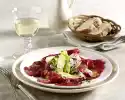 Sauté the meat in portions in hot oil. Season and remove. Fry onions and mushrooms