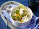 Put the meat back in the roaster. Sprinkle with flour, sweat. Add a good 3/4 l water, wine and cream, bring to the boil. Stir in broth. Cover and cook for about 30 minutes. Add peas after about 20 minutes. Sprinkle with almond flakes. Spätzle taste good with it