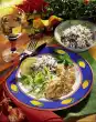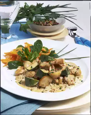 Heat the oil in a pan. Fry the onion, meat and mushrooms over a high heat for 4 minutes, turning them over. Add the zucchini and fry for another 2 minutes. Season with salt, pepper and paprika. Deglaze with 200 ml water and bring to the boil. Stir cream, mustard and flour until smooth and thicken the sauce. For the raw vegetables grate carrots coarsely. Mix vinegar, pepper, some sweetener and the rest of the oil. Turn carrots and lamb's lettuce in it. Serve everything. Sprinkle with chive rolls