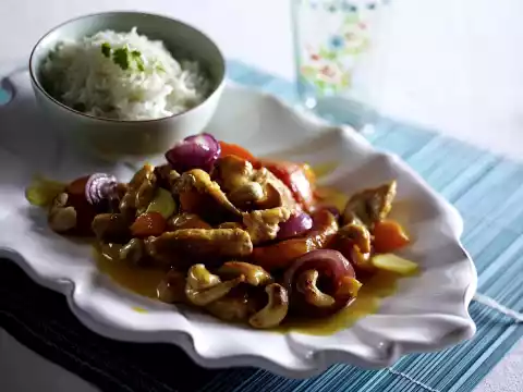 Roast the cashew nuts in a pan without fat until golden brown, take them out. Wash the meat, dab dry and cut into strips. Prepare rice in boiling salted water according to package instructions.