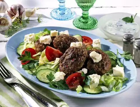 Mix yoghurt, cucumber and mint. Season with salt and cayenne pepper. Soak toast in cold water for about 5 minutes. Break the feta cheese roughly. Peel garlic and chop finely. Mix the minced meat with the well squeezed toast, garlic, egg, cumin and sambal oelek.