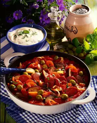 Add onions and sausage slices after 6 minutes and fry. Chop tomatoes with a knife in a tin and add. Cook for 10 minutes. Clean and wash the tomatoes. Cut tomatoes into slices. Stir in tomato slices and olives and heat up briefly. Season goulash with salt, pepper and paprika. Wash parsley, dab dry and chop coarsely. Sprinkle over the goulash. Mix yoghurt and lemon juice. Wash mint, dab dry. Pluck the leaves from the stalks and cut into strips.