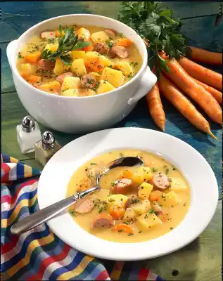Heat the fat in a pot. Fry diced vegetables, potatoes and onion. Add stock and bring to the boil. Cook everything over medium heat for 20-25 minutes. In the meantime, slice the sausages and add them to the vegetables 5 minutes before the end of the cooking time. Wash and finely chop the parsley. Grate remaining potatoes in the stew and stir in. Bring to the boil again. Season to taste with salt and pepper.