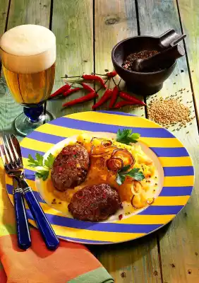 Heat the oil in the pan and brown the onion rings in it. Remove them as well. Fry the meatballs in the hot oil for about 4 minutes on each side. Finally, add the onion rings to the meatballs and warm them up.