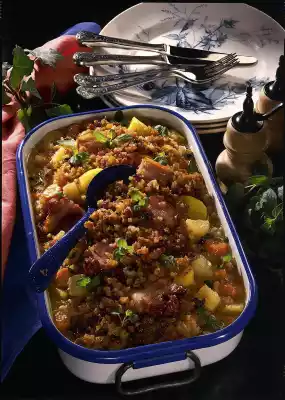 Pour the vegetables into an ovenproof dish. Cover with the liquid. Spread the crust mixture and fat in flakes on top. Bake everything in a preheated oven (electric: 200 °C/ gas: level 3) for about 15 minutes.