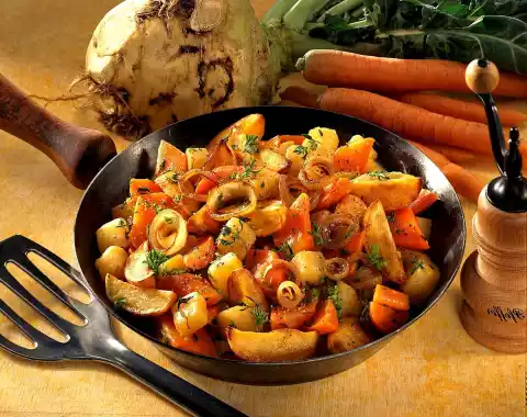 Wash and peel rutabaga, carrots and potatoes. Dice the turnip, cut the carrots in half lengthwise and cut them diagonally into pieces. Cut potatoes into slices. Peel onions and cut into rings. Wash thyme, dab dry and pluck the leaves from the stems. Heat 10 g clarified butter in a pan, fry turnip and carrots in it and deglaze with stock. Add half of the thyme and cook covered for about 15 minutes.