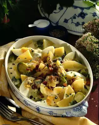 Drain the vegetables and collect the cooking water. Melt fat, add flour and sweat. Stir in vegetable water, milk and mustard. Add vegetables and simmer for 5 minutes at low heat. Season to taste with salt and pepper. Add eggs shortly before the end of cooking time and warm up. Cut bacon into cubes. Peel onion and cut into rings. Fry bacon in a pan without fat until crispy, add onion rings and fry until golden brown.