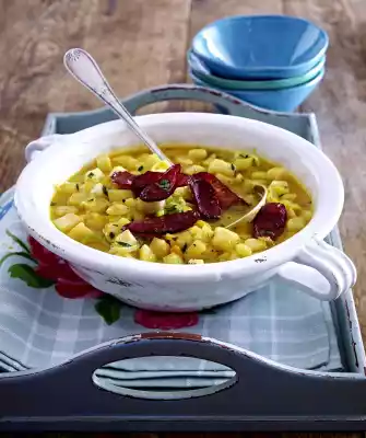 In the meantime clean and wash the leek and cut it into fine rings. Wash the herbs, shake dry and chop finely separately. Cook the leek and lovage for about 10 minutes in the stew. Season to taste with salt and pepper.