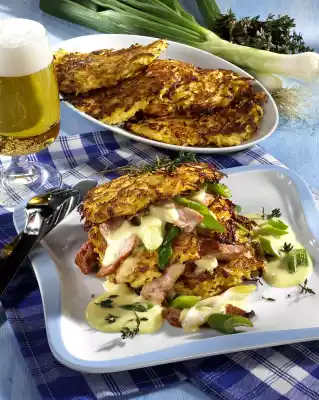 Fry until crispy brown, turning the meat and place on a plate. Keep finished buffers warm. Fry 9 more buffers from the remaining mixture. To serve, stack 3 buffers on a plate with some Kasseler ragout in between.