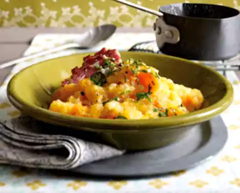 Wash the parsley, shake dry and cut into fine strips. Take out the bacon and mash the turnip vegetables with a potato masher.
