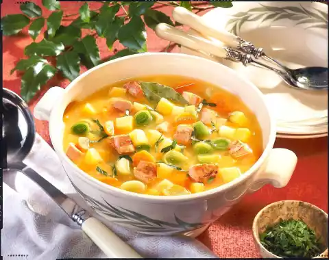 Add turnip and fill up with the stock. Add bay leaf. Simmer for about 30 minutes. In the meantime clean, peel and slice the carrots finely. Peel and wash the potatoes and cut them into large cubes. Add the carrots and potatoes about 10 minutes before the end of the cooking time. Clean, wash and cut leek into coarse rings. Add leek for the last approx. 5 minutes. Wash parsley, dab dry, pluck leaves from stems and cut into fine strips.