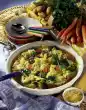 Add the carrots and potatoes about 10 minutes before the end of the cooking time. Clean, wash and cut leek into coarse rings. Add leek for the last approx. 5 minutes. Wash parsley, dab dry, pluck leaves from stems and cut into fine strips. Season stew with salt, pepper, nutmeg and vinegar. Sprinkle with some parsley and serve the rest separately
