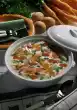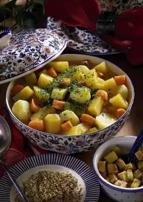 Peel and wash the potatoes and, depending on their size, cut them in half or quarters. Peel, wash and cut the turnip into cubes. Clean, wash and cut carrots into thick slices. Put vegetable stock and 2 litres of water in a pot. Cook potatoes, turnips and carrots for about 20 minutes. Cut the tofu into small cubes. Heat oil in a pan and fry the tofu cubes in it until golden brown. Finally add sesame seeds. Wash parsley, dab dry and chop. Add to the vegetables and season with salt and pepper. Before serving, pour the tofu and sesame seeds over the stew
