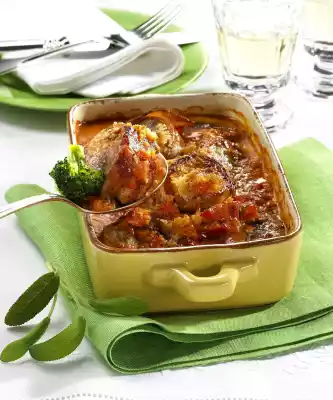Remove and place in a greased casserole dish. Wash, clean and finely dice the tomatoes. Peel and finely dice the onion and garlic. Wash the herbs and chop them except for some basil for garnishing.
