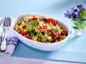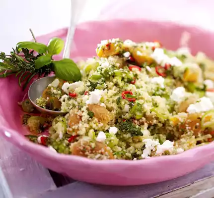 Loosen the couscous mix with a fork. Mix with the vinaigrette. Crumble the feta. Sprinkle couscous salad with feta.