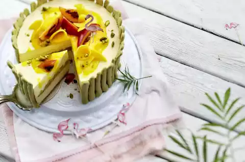 Coarsely chop the pistachios. Wash the tamarillo and cut into slices. Remove cake ring. Spread the rest of the mango puree in the middle of the Charlotte. Add mango slices and tamarillo. Sprinkle with pistachios.