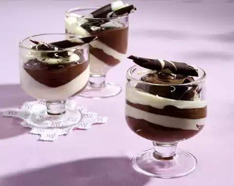Soak gelatine in cold water. Chop 200 white and 200 dark chocolate glazes separately and melt over a warm water bath. Stir sugar and 125 g of sour cream into the dark chocolate. Stir 125 g of sour cream into the white chocolate. Squeeze the gelatine well. Dissolve carefully, stir half of the gelatine into the dark mass, stir the remaining gelatine into the light mass. Whip the cream until stiff, fold half of the cream into the creams. Place 4-6 glasses at an angle in egg cartons (or similar). Layer the creams alternately. Chill for about 2 hours. Chop 50 g dark and white couverture each, melt separately. Spill the chocolate coating alternately on a marble board and allow to set. Use a spatula to remove the rolls. Decorate the cream with it