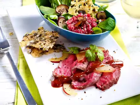 Wash and clean the lamb's lettuce. Season lime juice with 1 pinch of sugar and pepper, fold in 2 tablespoons of olive oil. Mix with the salad. Spread the mushrooms on top. Add the tartar and the cheese chips. Cut meat into thin slices, a plum into thin slices. Serve the meat with the plum sauce and the plum wedges. Garnish with coriander