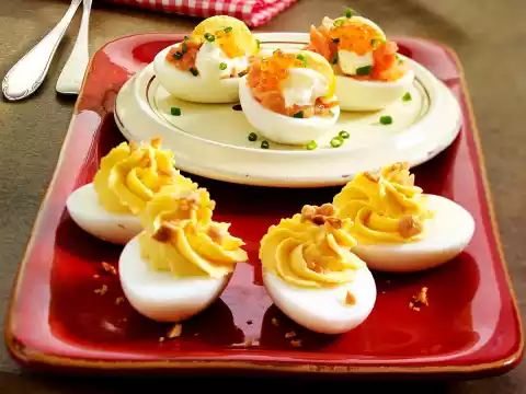 Stir in mayonnaise and soft butter. Season to taste with salt, pepper and curry. Pour egg cream into a piping bag with star-shaped spout and squirt into 6 egg halves. Sprinkle with peanuts. For the eggs with salmon tartare, finely dice fresh and smoked salmon.