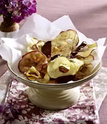 Pour approx. 1 1⁄2 l water and lemon juice into a large bowl. Wash the apples and cut out the core with an apple corer. Slice or cut apples into thin rings (approx. 1 mm thin).