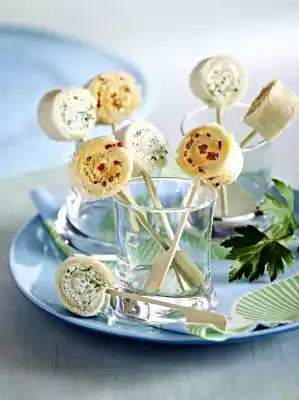 Remove cling film and cut rolls into slices of approx. 1 cm thick. Put on wooden skewers and arrange in glasses