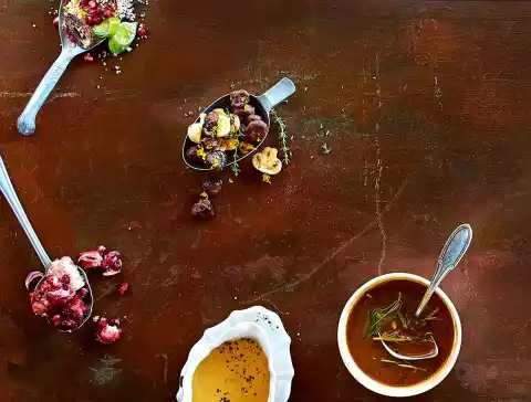 For the mushroom and herb sauce, degrease frying stock (see recipe for classic sauce Step 1) in a pot. Add 200 ml dry red wine, 1 package (12 g) dried mixed mushrooms, 1 small stem of rosemary and 2 leaves of sage to the sauce, simmer for about 5 minutes.