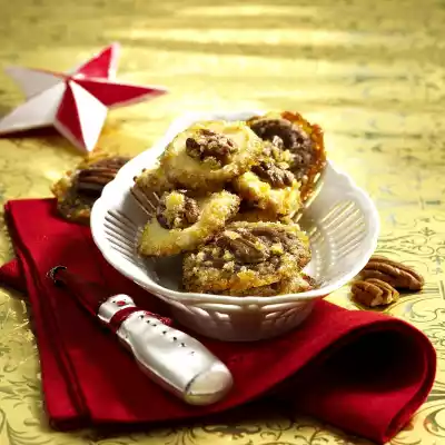 Mix with sugar. Whisk the egg yolk and spread it on the dough rolls. Roll in the orange sugar. Cut into approx. 1/2 cm thick slices and place on 2 baking trays lined with baking paper. Press the pecan nut halves in lightly and sprinkle them with some remaining orange sugar. Bake the trays one after the other in a preheated oven (electric cooker: 175 °C/ convection oven: 150 °C/ gas: level 2) for 10-12 minutes