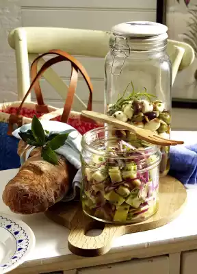 Cut off the rind from the mountain cheese, dice the cheese. Peel and halve onions and cut into strips. Wash the chives, dab dry and cut into fine rolls. Mix cheese with onions, chives, vinegar and 100 ml oil. Season with pepper. Keep cold