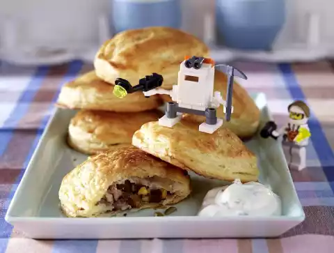 Place half of the circles on the trays and place the filling in the middle of each. Cover with 1 pastry circle each and press the edges together. Spread a thin layer of milk on the puff pastry tufos.