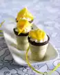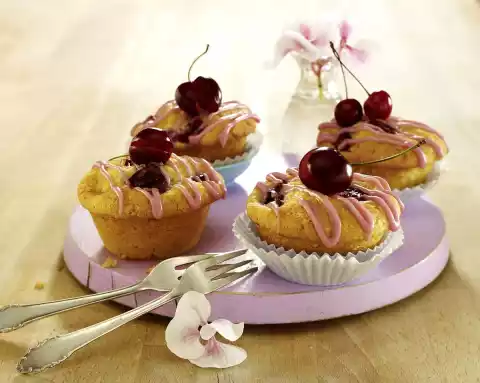 Remove from the oven and let cool on a cake rack. As soon as the muffins are cold, sift icing sugar into a bowl. Add 2-3 tbsp. cherry juice and mix to a thick icing. Pour the icing into a piping bag. Cut off a small tip and draw fine lines on the muffins. Arrange the muffins decorated with cherries