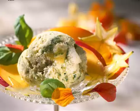 Wash the basil, dab dry, remove the leaves and chop very finely. First mix fruit puree and egg yolk foam. Then cream and finely chopped basil, and finally fold the stiff beaten egg white into the puree.