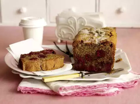 Mix the undefrosted raspberries with 1 tablespoon of flour. Pour 1/4 of the dough into a greased box form (26 cm long). Fold the raspberries into the rest of the dough, place in the tin and smooth down.