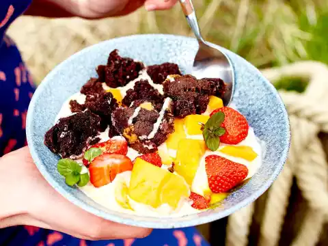 Peel the mango, cut the flesh off the stone and dice. Wash, clean and halve the strawberries. Crumble the brownie (if possible lukewarm) coarsely. Arrange vanilla cream, fruit and brownie crumbs.