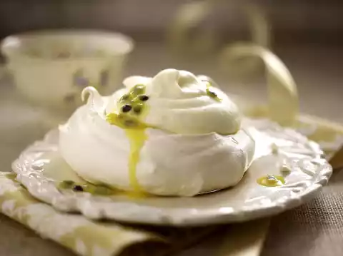 Let milk cool down for about 5 minutes. Mix egg yolks and 25 g sugar. Stir in hot milk bit by bit. Pour egg milk back into the pot. Heat with a wooden spoon while stirring until the cream thickens (do not let it boil, otherwise the egg yolk will curdle!) The cream has the right consistency when it is left on the spoon (peel off to form a rose). Pour the cream into a bowl. Squeeze the gelatine, dissolve in the hot cream. Chill the cream, stirring occasionally. When the cream begins to gel, whip the cream until stiff, fold in carefully. Halve the passion fruit, spoon the pulp into a bowl, stir well with a fork. Remove the meringue from the baking paper and place on plates. Pour the cream into a piping bag with perforated spout and squirt into the meringue bowls. Sprinkle with passion fruit sauce and serve immediately