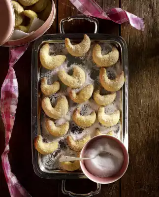 Form slices into croissants and place on 2 baking trays lined with baking paper. Chill the croissants for about 30 minutes, then bake in a preheated oven (electric range: 175 °C/ convection oven: 150 °C/ gas: level 2) for 12-15 minutes. In the meantime, mix approx. 150 g sugar and 1 packet of vanillin sugar on a tray. Remove the cookies from the oven, let them cool down briefly and carefully turn in the sugar.