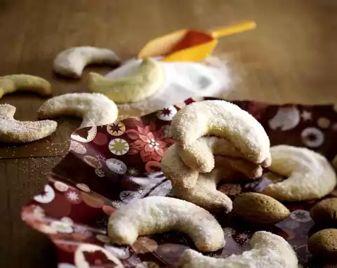 Put flour, almonds, 90 g sugar, salt and butter in flakes into a mixing bowl, first with the dough hooks of the hand mixer, then knead with your hands to a smooth dough. Wrap in foil and chill for about 1 hour. Form the dough into several rolls (approx. 1.3 cm Ø). Cut into 6 cm long pieces and form croissants. Place on 3 baking trays lined with baking paper.