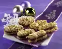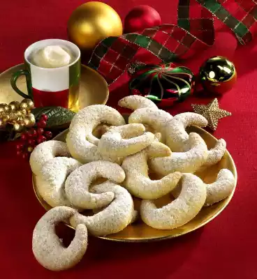 Form the remaining dough into a roll (30 cm long) on a floured work surface. Cut the roll into 30 slices. Roll sticks (9-10 cm long) out of the slices and shape into croissants. Place the croissants on two baking trays covered with baking paper. Bake the trays one after the other in a preheated oven (electric cooker: 200 °C/ convection oven: 175 °C/ gas: level 3) for about 10 minutes. Place baking trays on cake rack. To dust, mix approx. 50 g icing sugar, vanilla sugar and sugar and dust over the hot croissants with a sieve. Let it cool down. Remove the croissants from the baking tray, take the sugar off the paper and use it for the next hot croissants.