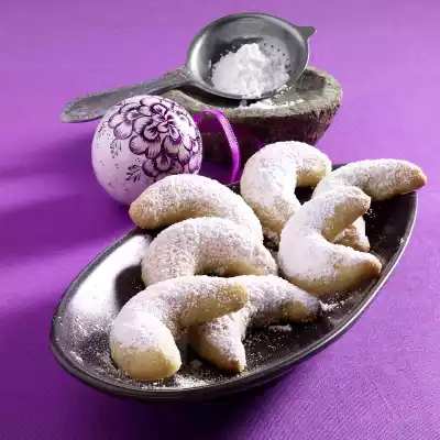 Sift icing sugar and mix with remaining vanillin sugar. Carefully roll hot croissants in it. Leave to cool on a cake rack. Keep the croissants well closed in tins in a cool place. Keep for approx. 4 weeks.